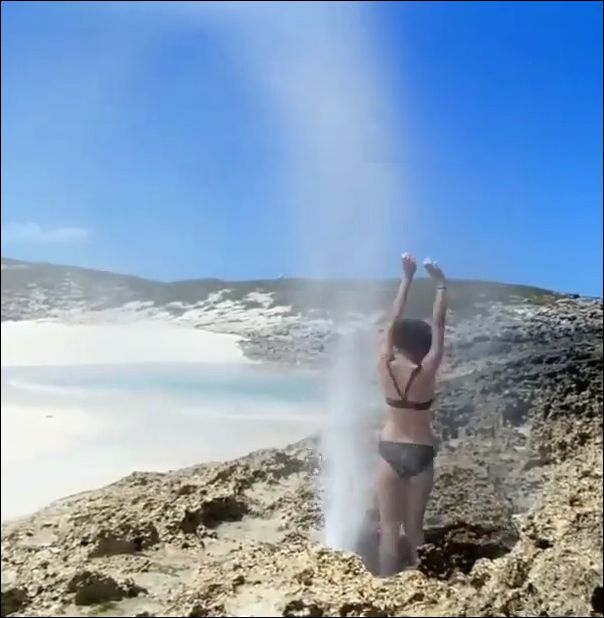 какой гейзер) обычный скальный сифон, волны попадая в него выплескиваются через узкое горлышко таким вот фонтаном — довольно распространенное явление в прибережных скалах.