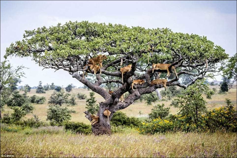 Назойливые мухи, живущие в траве, не дают львам покоя. Поэтому всё львиное семейство забралось на ветки раскидистого дерева.